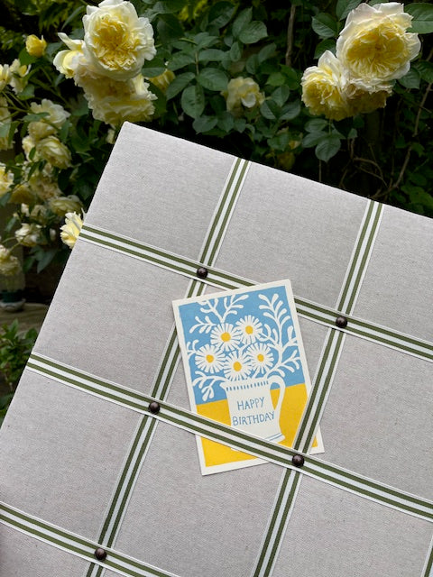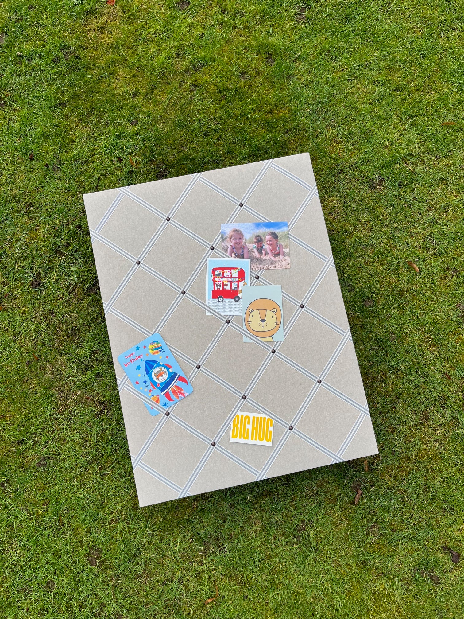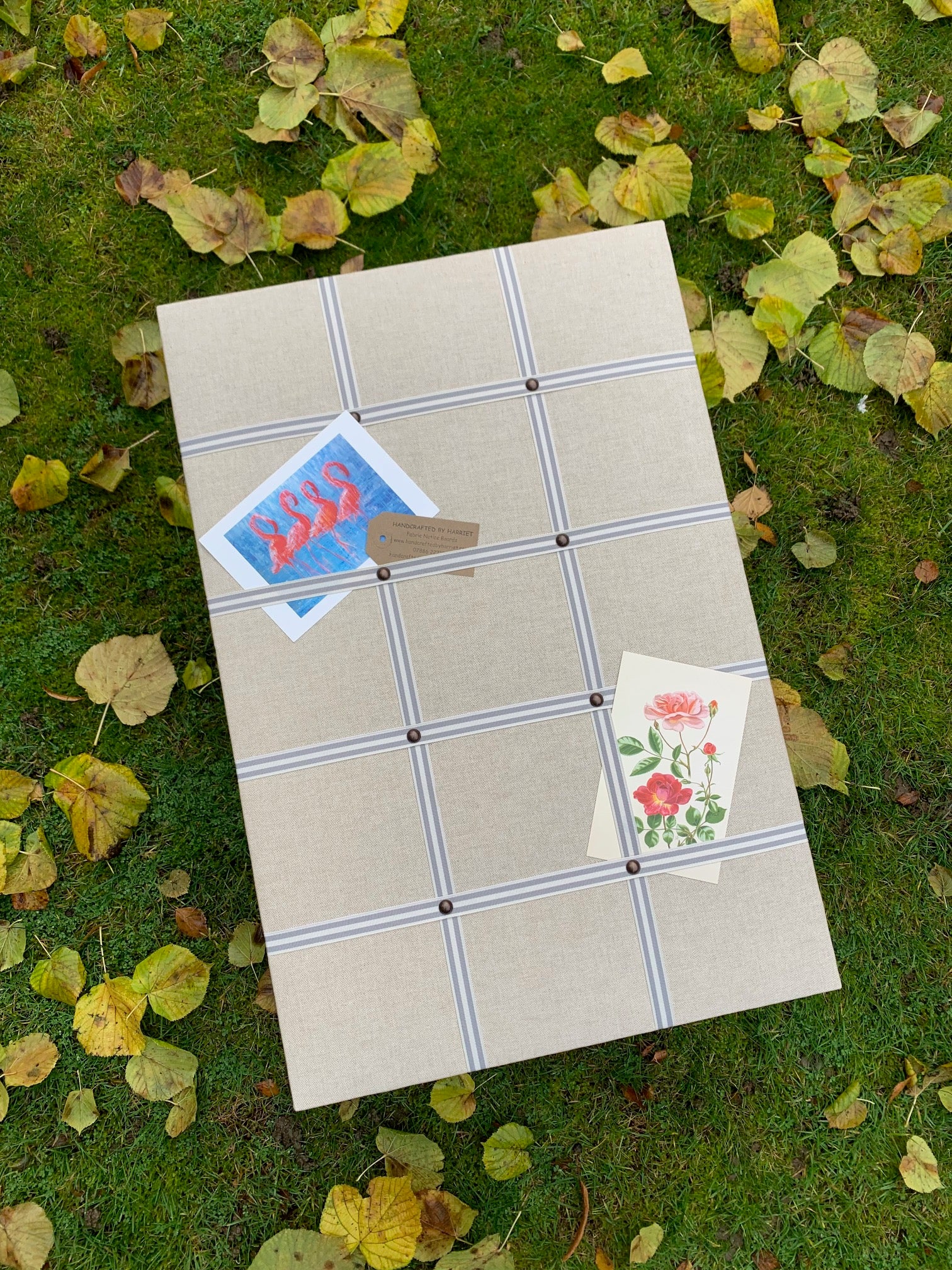 My notice boards are a great alternative to a cork pin board. There is no need to use pins because the ribbons are tightly secured with upholstery nails to ensure nothing will slip no matter how much you layer up. If however you would like to use the odd pin, you just need to push a little harder into MDF than you would with cork.
